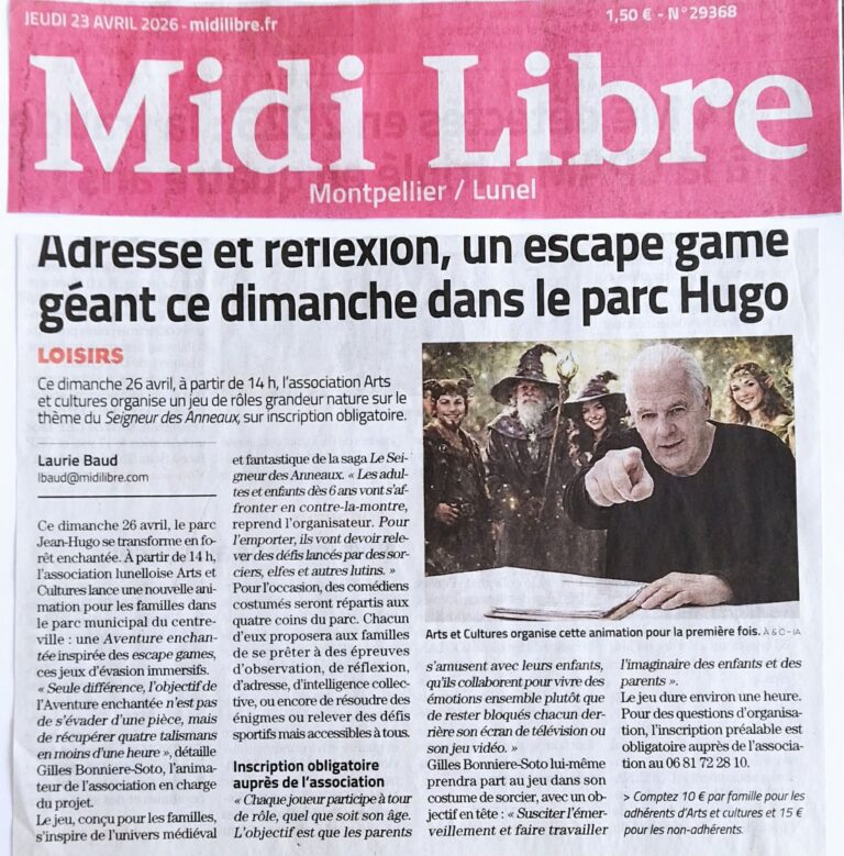 Arts & Cultures & Gilles Évènements présentent L’AVENTURE ENCHANTÉE Dimanche 26 avril 2026 Parc municipal Jean Hugo – Lunel Le temps d’une journée, le parc municipal de Lunel se transforme en un univers fantastique à ciel ouvert, où la magie…