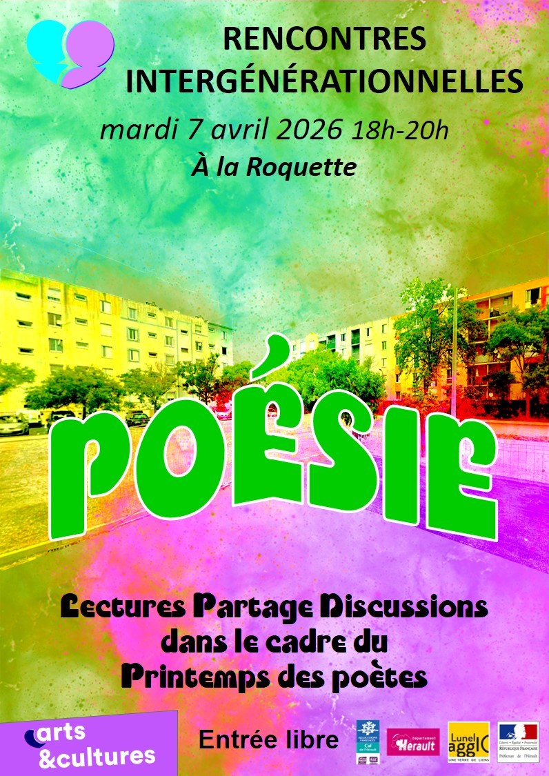 « Tous les Évènements Session poésie – rencontres intergénérationnelles à la Roquette 7 avril // 18h00 - 20h00 Gratuit « Rencontres intergénérationnelles du mardi soir: L’entreprenariat ! Journée à la Jonquera/Le Perthus – 19 avril 2026 » Ajouter au calendrier Google Agenda iCalendar Outlook 365 Outlook Live Détails Date : 7 avril Heure : 18h00 - 20h00 Prix : Gratuit Catégories d’Évènement: Poésie, Rencontres Intergénérationnelles Organisateur Arts et Cultures Téléphone 0953177189 Lieu 36 Place Jean Jaures 36 Place Jean Jaures Lunel, 34400 France + Google Map Téléphone 0953177189